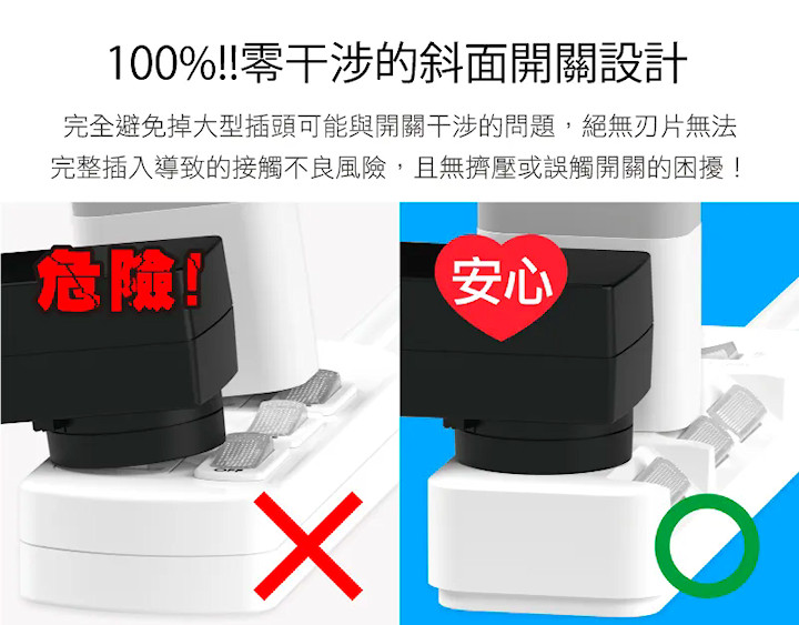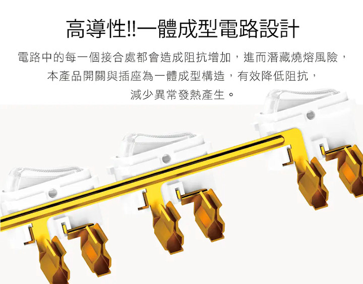180度可轉向平貼式插頭、3組一對一獨立式開關插座、多了1組內建過載自動斷電功能總開關、零干涉!!斜面式開關設計,可防止誤壓開關、一體成型電路設計、6KV抗雷擊!!突波吸收器、全機身採高耐熱防火PC材質、高導率4N級無氧銅+雙絕緣線材、變壓器專用插座X1、貼心壁掛孔設計。