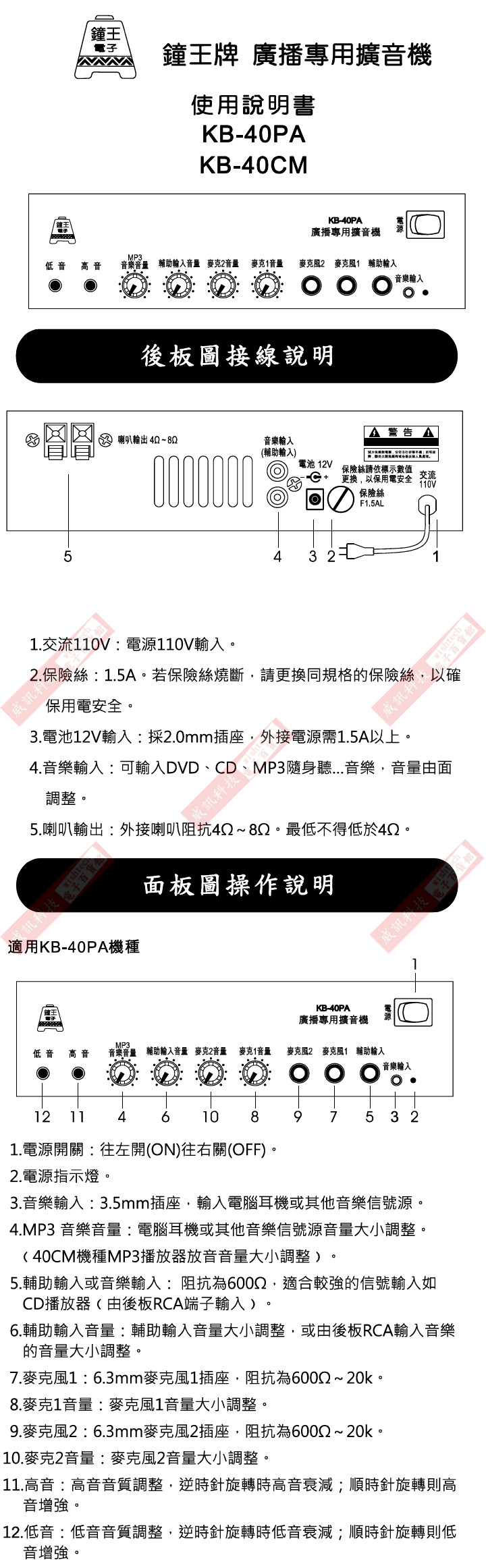 KB-40PA 鐘王牌 PA廣播專用擴音機 40W