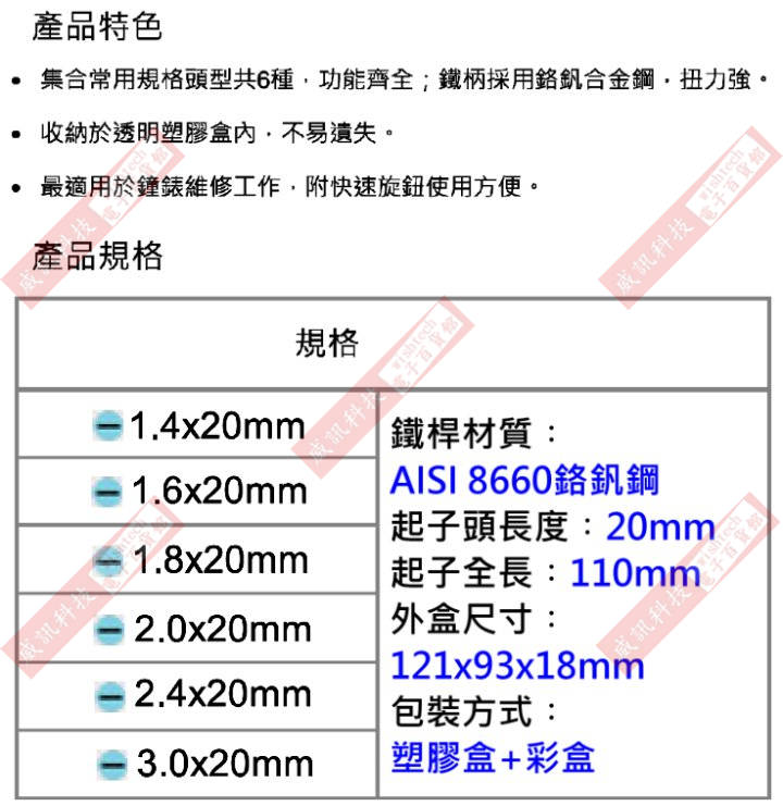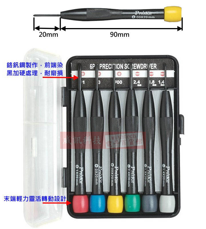 8PK-2062 寶工 Pro'sKit 彩頭一字鐘錶起子組(6支組)1.4~3mm