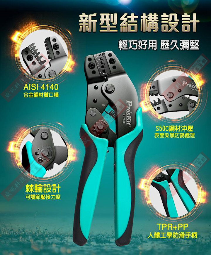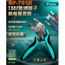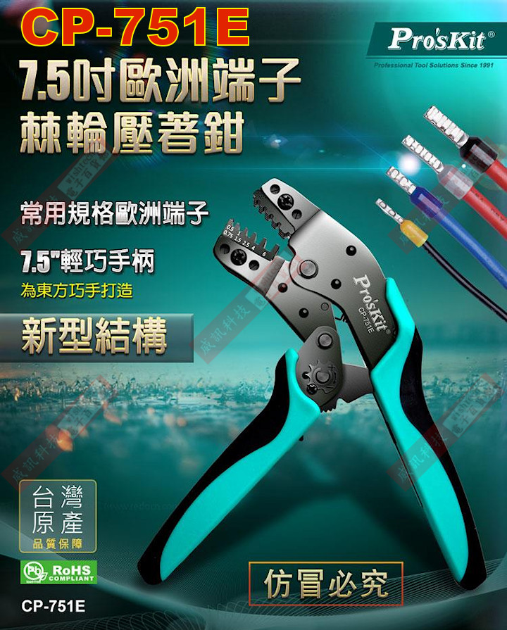 CP-751E 寶工 Pro'sKit 7.5吋歐洲端子棘輪壓著鉗 • S50C中碳鋼材質,表面染黑防鏽處理 • 口模精準壓接,品質優良保證 • 符合人體工學設計,雙色防滑手柄 • 省力棘輪裝置,提高效率 材質: - 本體: S50C - 手柄: PP+TPR - 口模: AISI 4140 Alloy Steel 硬度: 45 ± 3 適用規格: - AWG: 20-18 / 17-16 / 14 / 12 / 10 - DIN: 0.5-0.75 / 1.0-1.5 / 2.5 / 4.0 / 6.0mm2 - JIS: 0.5-0.75 / 0.9-1.25 / 2.0 / 3.5 / 5.5mm2 全長: 190mm