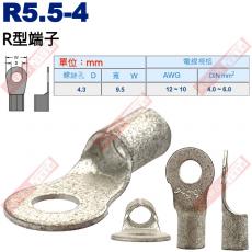 R5.5-4 R型端子 螺絲孔4.3mm AWG12-10/DIN 4.0-6.0mm² 尺寸 ︰ 螺絲孔D 4.3mm / 寬W 9.5mm 電線規格 ︰ AWG 12 ~ 10 / DIN 4.0 ~ 6.0mm²
